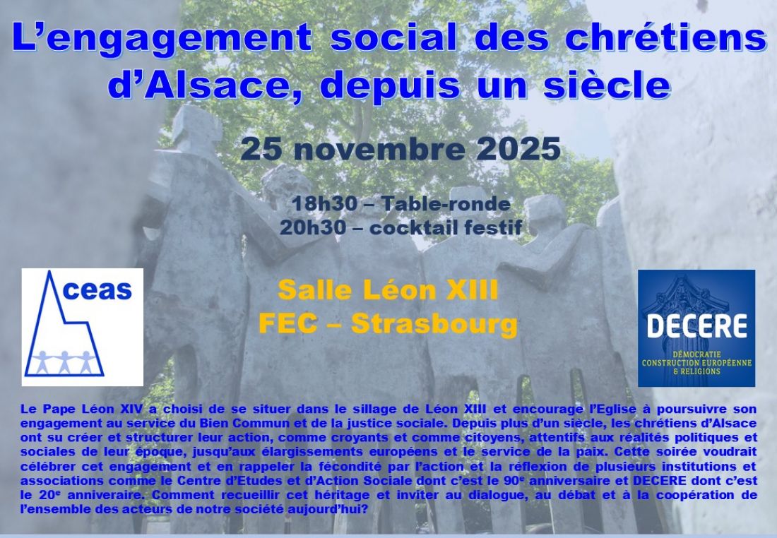 Fêtons et honorons, à travers les 90 ans du CEAS et les 20 ans de DECERE, l'engagement social des chrétiens, en Alsace et en Europe, la profondeur de leur espérance, leur persévérance et leur confiance.